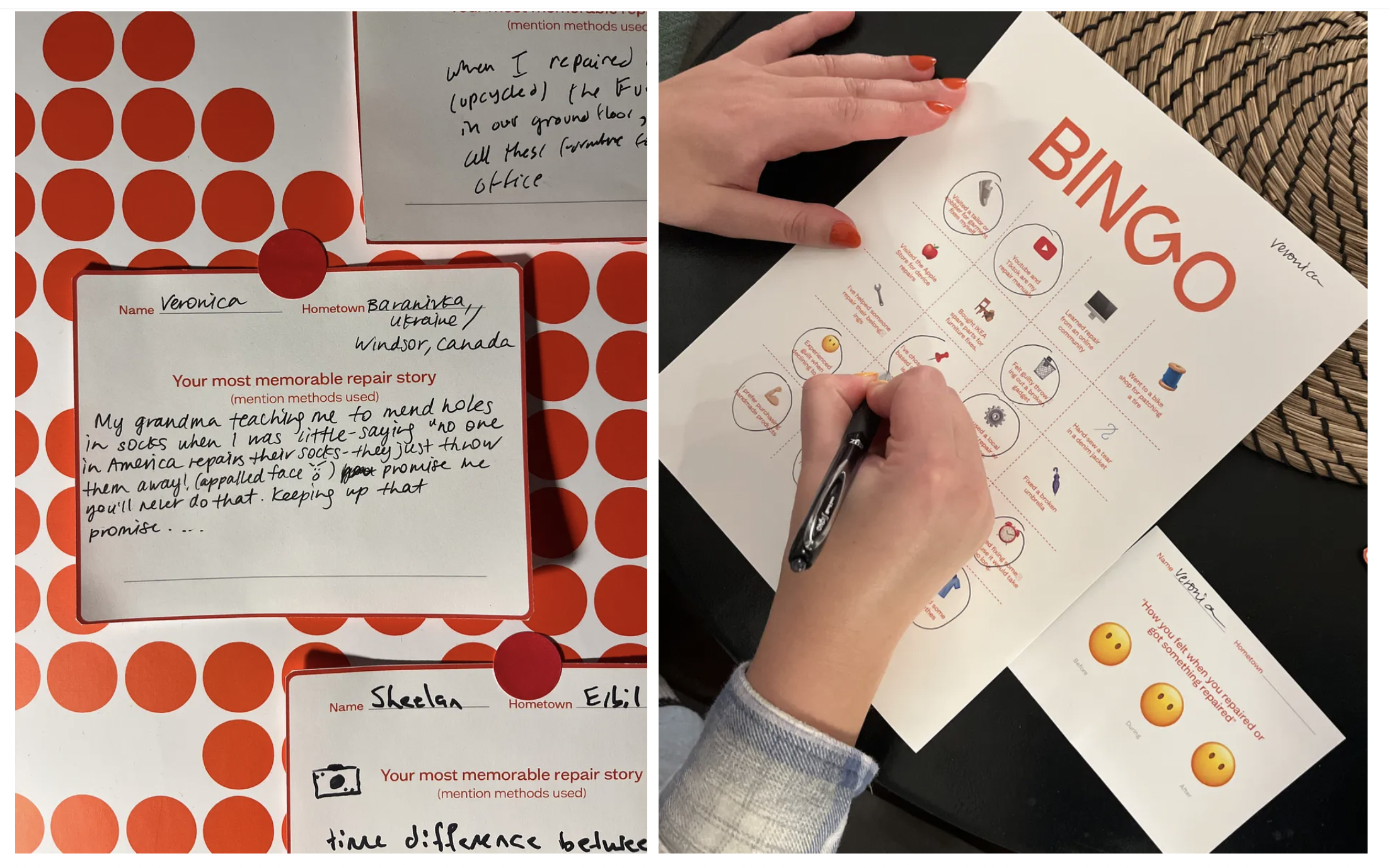 Bingo cards with various repair or end experience scenarios (e.g., “Replaced a phone battery,” “Mended a torn shirt,” “Stopped a gym membership,” “Repaired a relationship”). Participants circle the ones engaged with. The goal was for participants to recognize repair as a concept beyond clothing, spanning different industries and life situations.