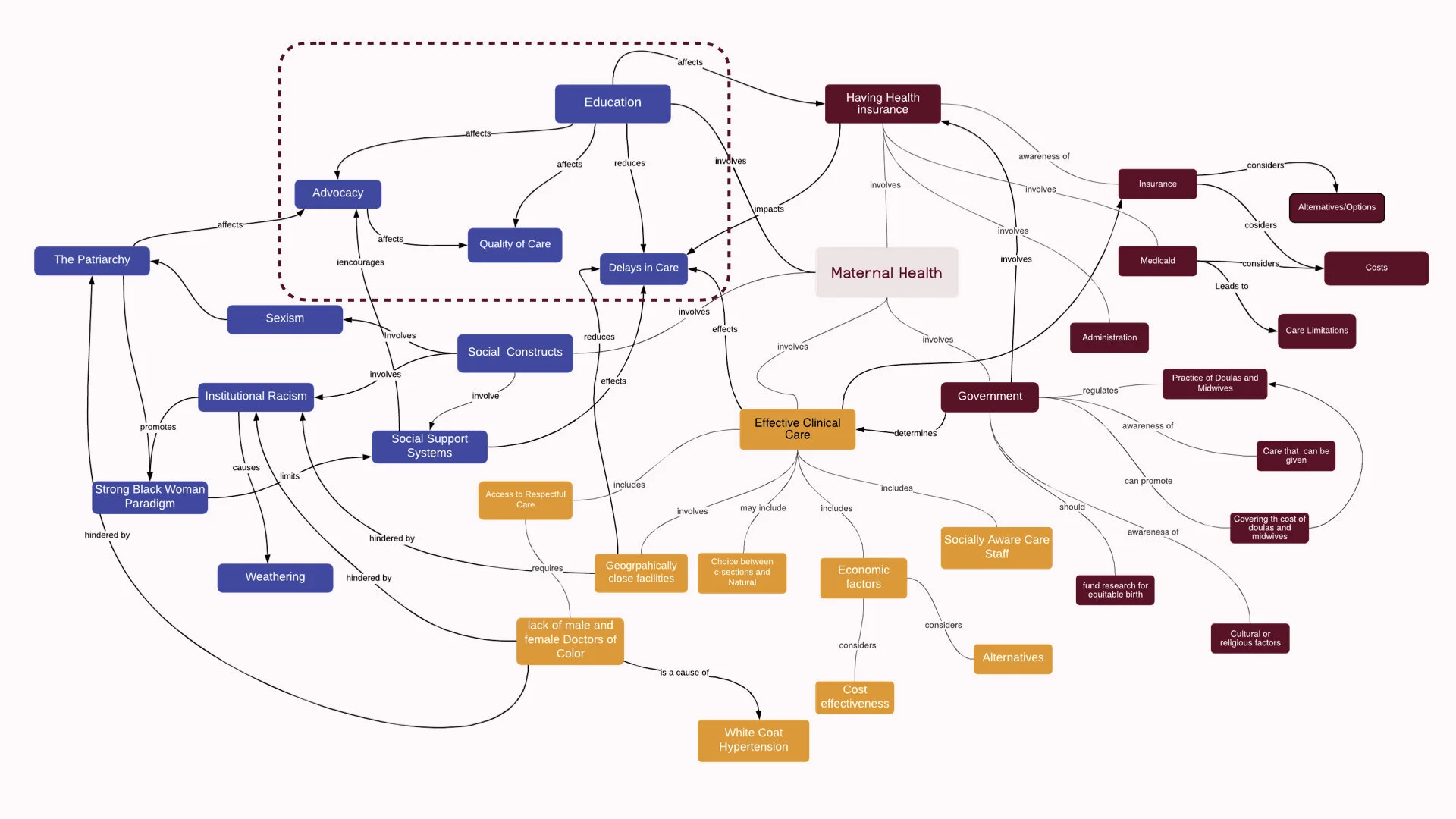 The Care Collective is a proposal for a reimagined women's and family healthcare service and OB-GYN clinic; this clinic focuses on bringing prenatal, and pregnancy care out of traditional examination rooms and into groups of other women who are just as far along in their pregnancy. This less institutional setting results in lower anxiety around the doctor's office, offering improved opportunities for pregnancy education and support—all with a focus on black women. Care Collective structures appointments by first having individual health assessments with patients, where they have their vitals taken and are free to ask questions personally to the doctor or midwife. The group of 5-6 women comes together in the second half of the appointment to discuss various pregnancy and postpartum topics together.