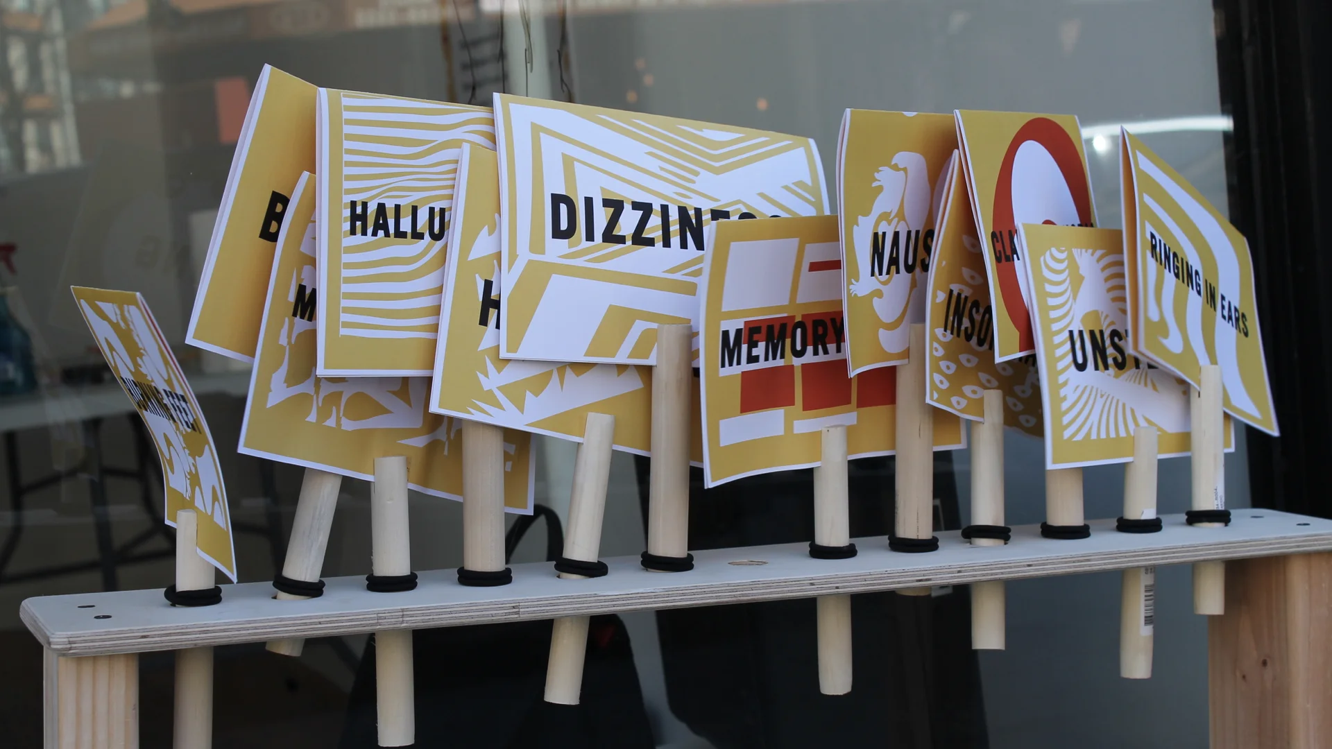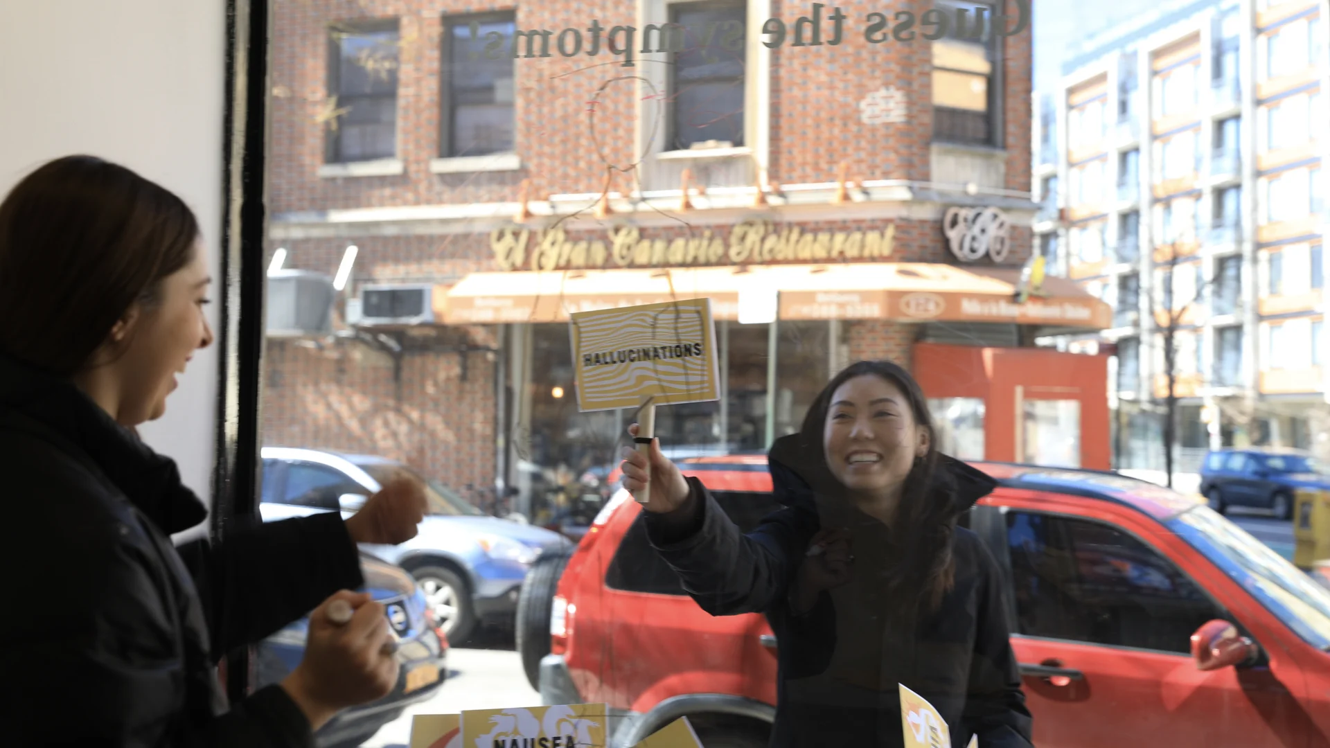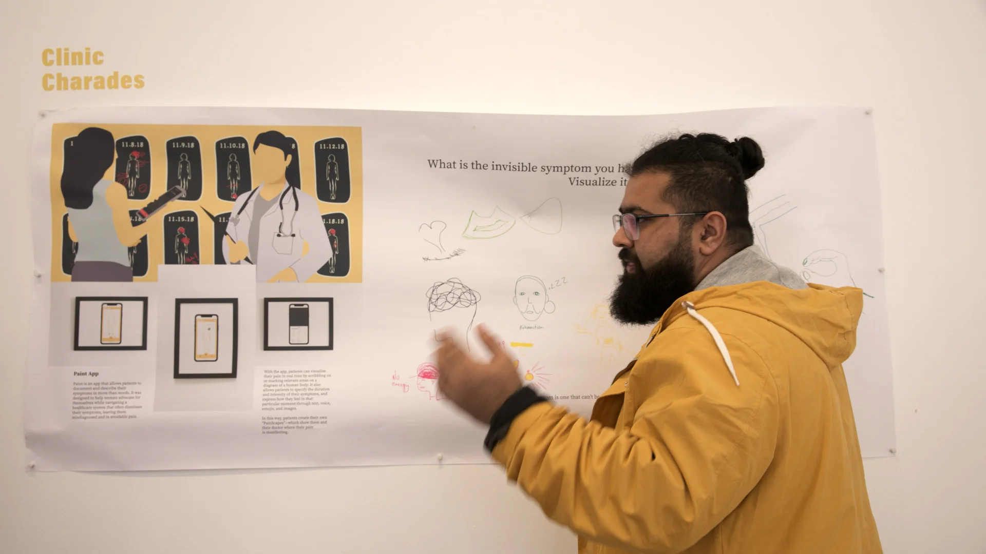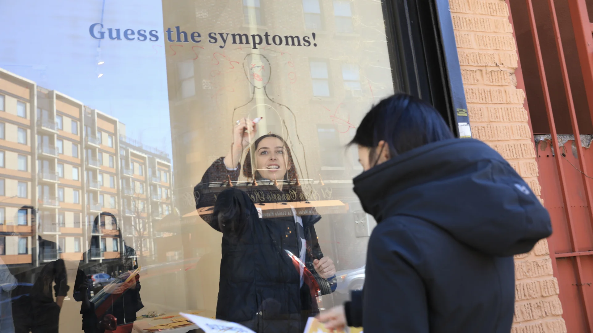 Clinic Charades is a social game that aims to equip people with a different set of tools to describe their symptoms—rather than using conventional language, participants translate their symptoms into visual expressions of pain. The game focused on discussing invisible symptoms—symptoms that are hard to measure or describe. First, participants play a two-player game of Clinic Charades, where one person is assigned a symptom and draws it on a window display, and the second player, on the other side of the window display, guesses it. After players get comfortable drawing and guessing symptoms, they are asked to draw their own invisible symptoms.