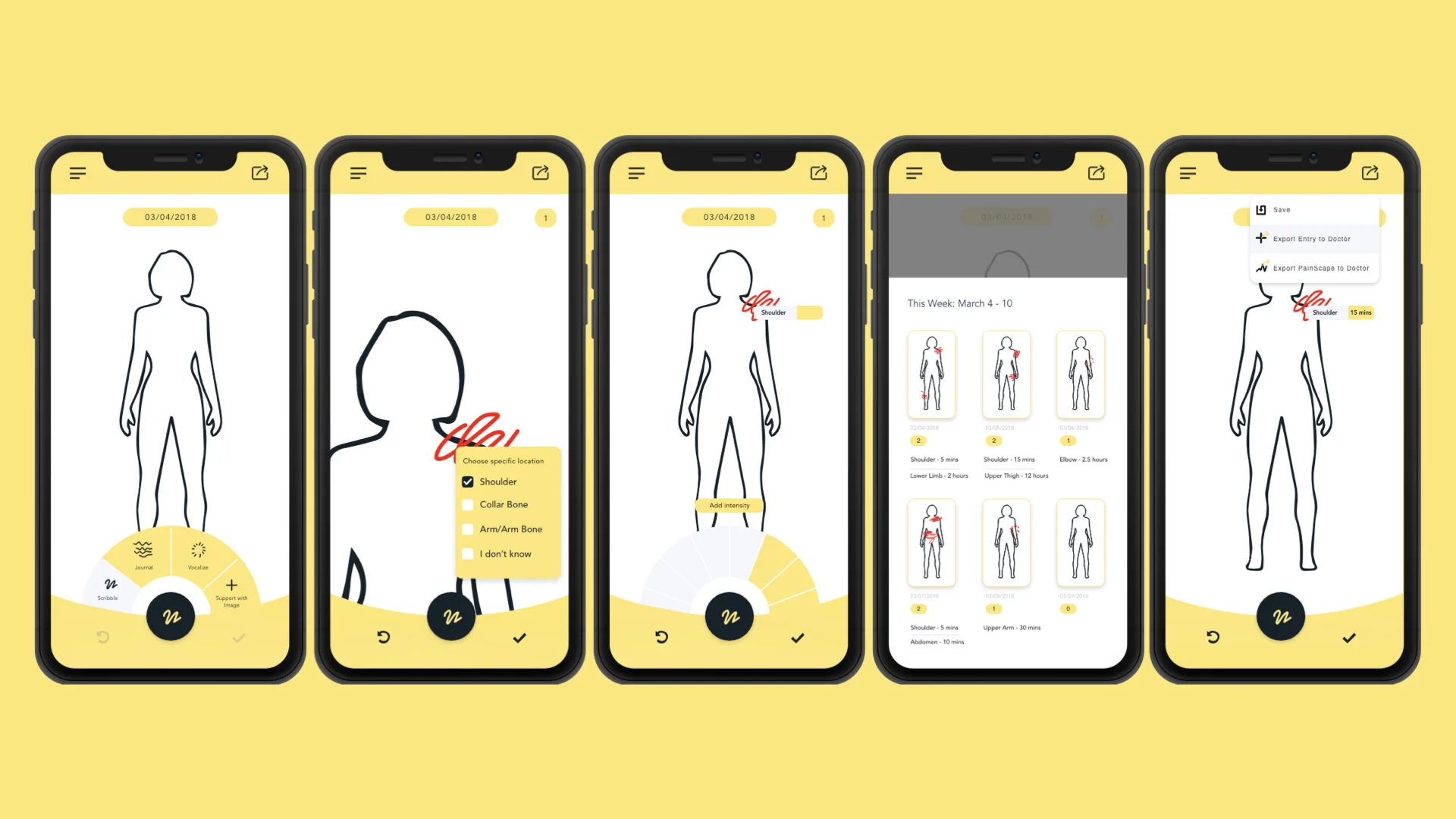 An aggregation of these entries helps patients create their own “PainScape,” which shows where their pain is manifesting. The app provides a summary of the patient’s predominant and minute pain areas—making it easier for doctors to understand the patient’s experience. The PainScape not only helps the patient effectively communicate their pain to others; it also helps the patient understand their own pain.