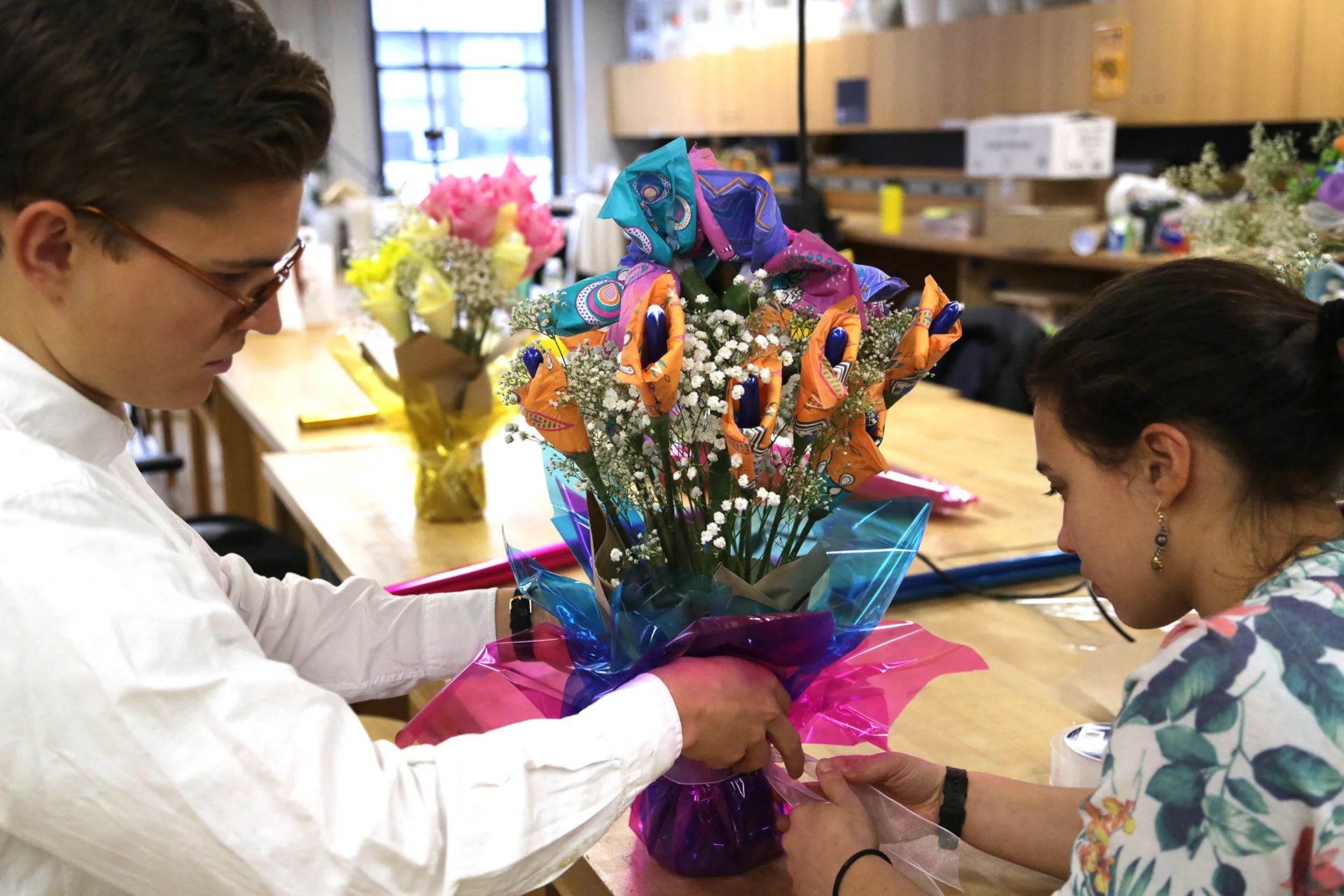 For the videos, the students created all of the props—including the flower bouquets, logos, brands, and apparel.