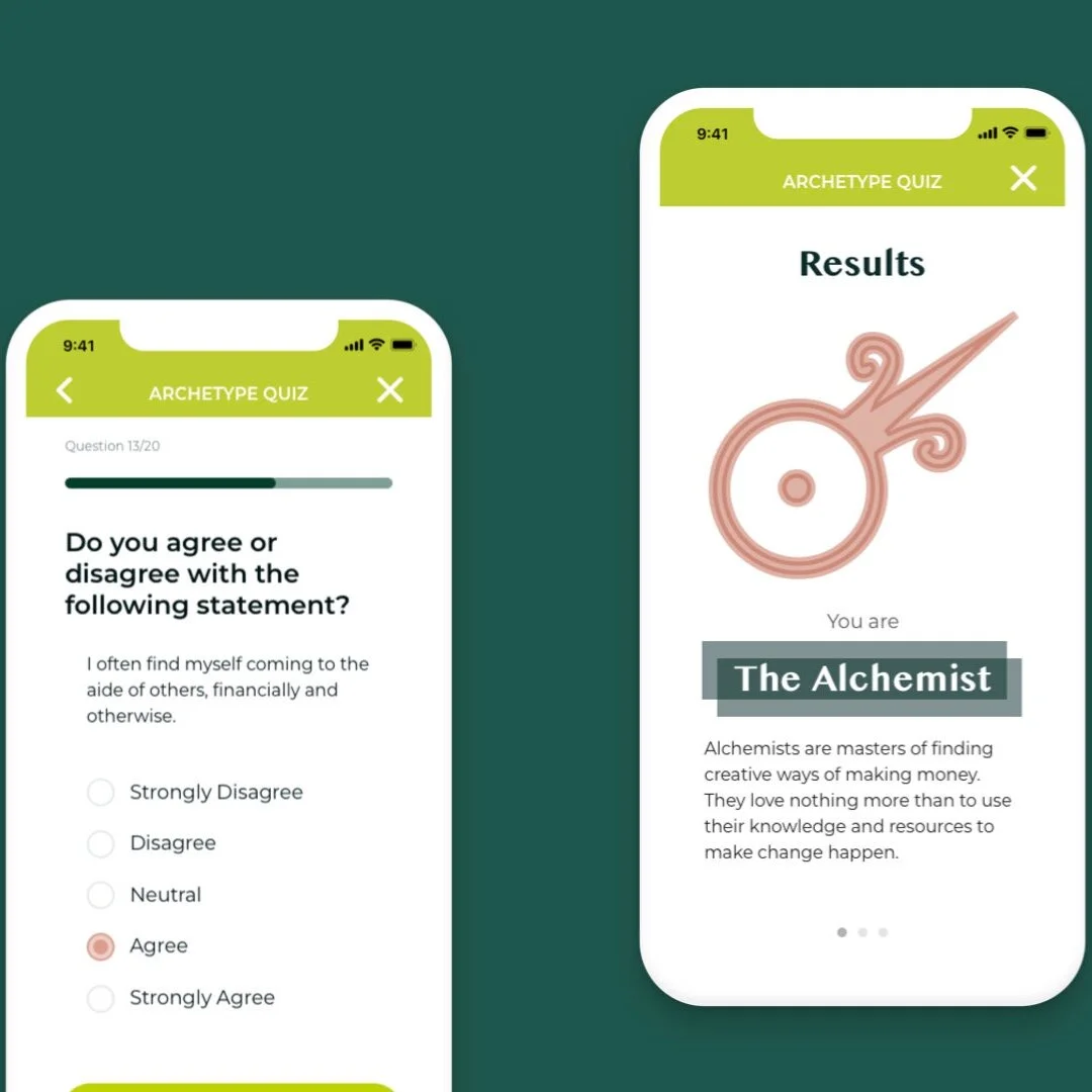 In the Money Coven app, an assessment of the user’s financial attitudes and values uncovers their Money Archetype. In Jungian psychology, archetypes are character or behavior models that we, sometimes subconsciously, use to shape our own personalities. Many of the archetypes in the tarot cards are also present in psychology literature, so Yuko leveraged the complementary practices to produce a compelling and unconventional narrative within a personal finance app. Yuko explains, “Identifying your archetype is useful because, when you can observe an archetype operating within you, you then have the opportunity to differentiate yourself from it.”