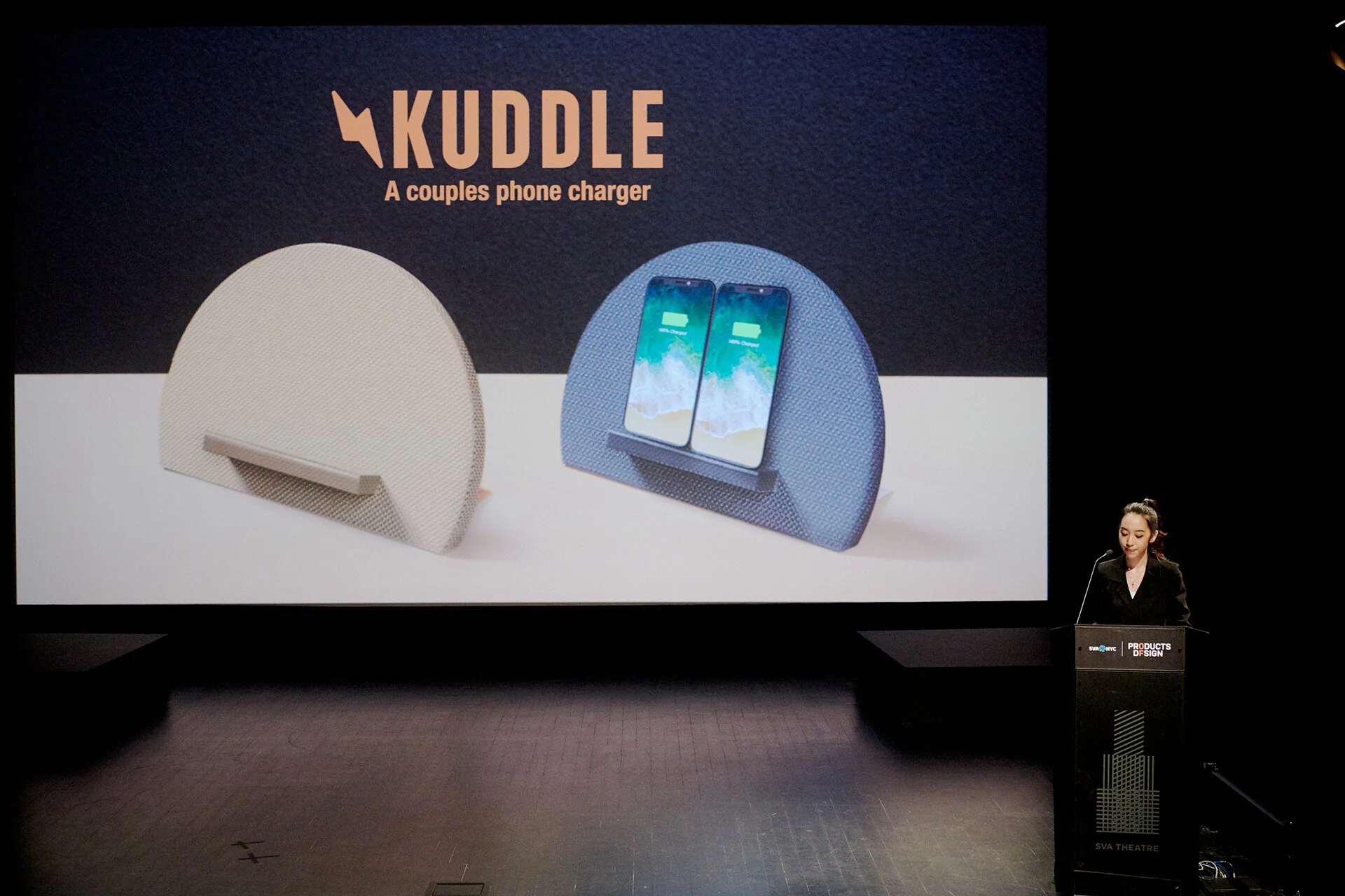 Kuddle is a wireless phone charger that encourages couples to spend more meaningful time communicating face-to-face. The dock only charges when two phones are placed side-by-side. “If only one partner puts their phone down, the device won’t charge,” Crystal explains. “Like a metaphor of a relationship, the phones will only charge if the two are close together on the dock.”
