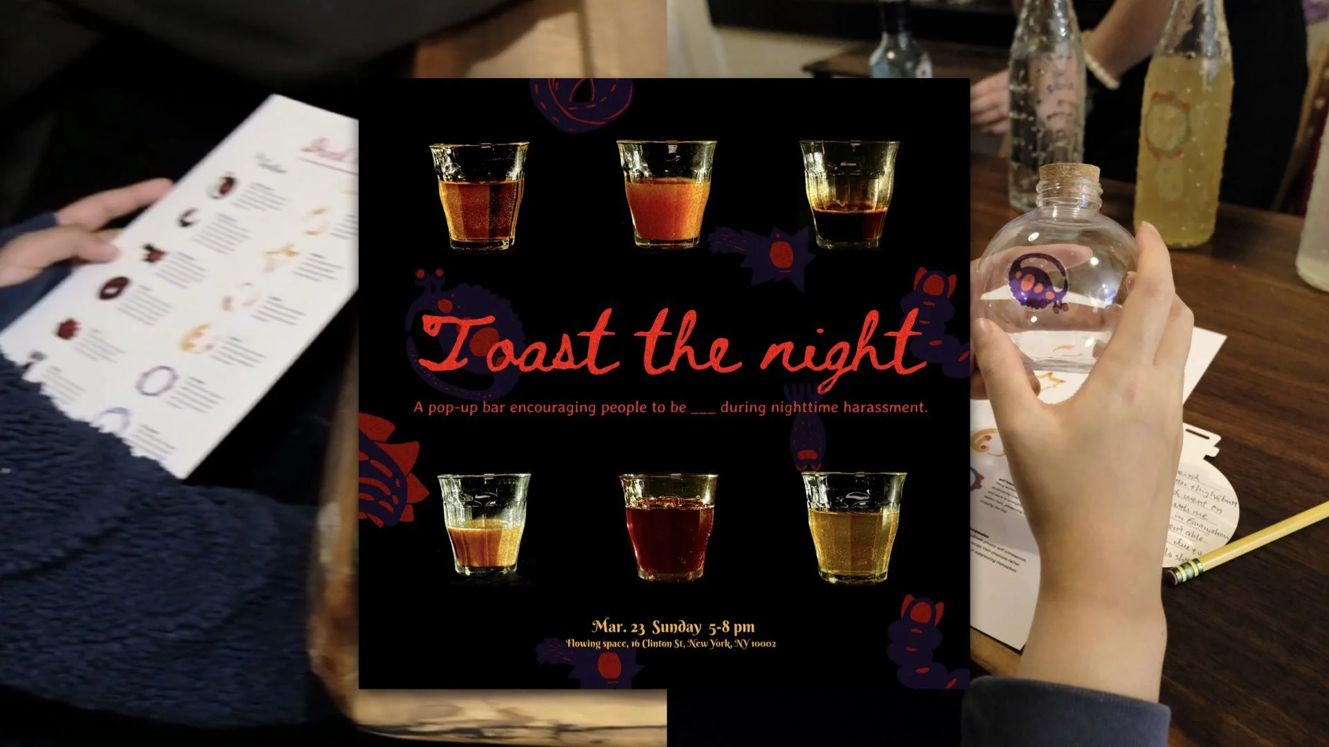 As Jingyi deepened her research, a new concern surfaced: safety in the invisible hours. Bokaya, a participant in a co-creation workshop, shared, “Since my job involves serving alcohol, a major challenge has been people attempting to touch me inappropriately.” In response, Jingyi designed Toast the Night, a pop-up bar experience hosted in downtown Manhattan on March 23. The gathering created a space for night shift workers to share stories, exchange resources, and support one another in navigating nighttime safety.