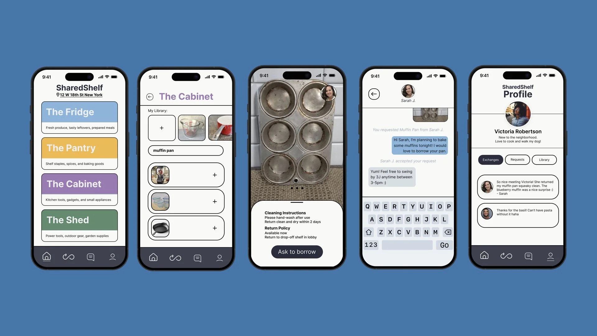 Trust and safety were common concerns, particularly around perishables or high-use kitchen tools. To address this, SharedShelf includes features that promote care and accountability: a reciprocity guideline to encourage participation in both lending and borrowing, and time-sensitive nudges that guide neighbors to make use of listed perishables before they go to waste. These subtle design choices help build a culture of mutual support, making everyday exchanges feel less like transactions and more like small acts of shared stewardship.