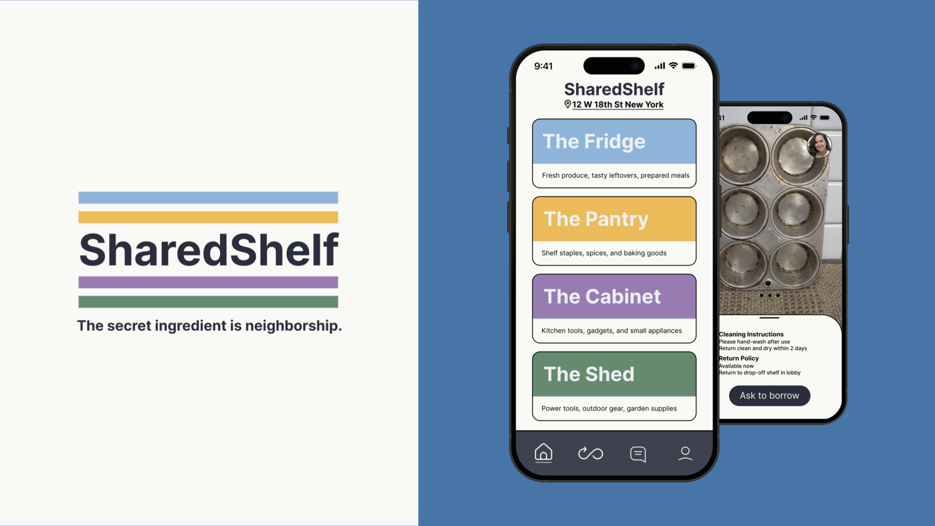 How do we turn waste reduction into a shared, neighborly act? Emma sought to tackle one of sustainability’s toughest challenges: turning intention into action. Behavioral science shows that people are more likely to change when they see others doing the same—yet in cities like New York, many neighbors barely know each other. What if reducing waste could also build community? SharedShelf is a hyperlocal lending platform designed to make sharing household items, ingredients, and tools simple—and social. By creating visibility into what neighbors have on hand, the platform lowers the barrier to connection and encourages reciprocity.