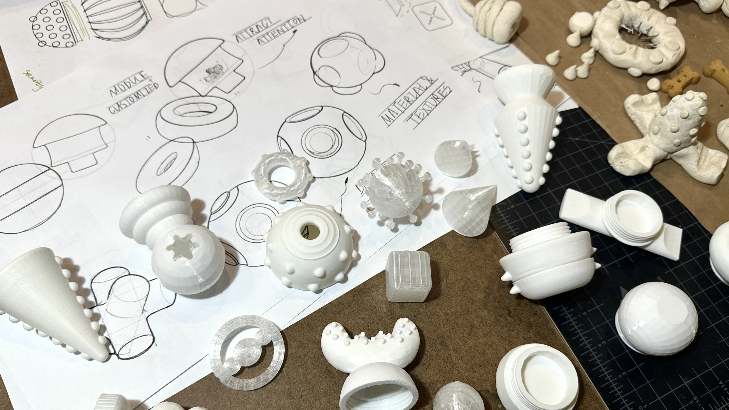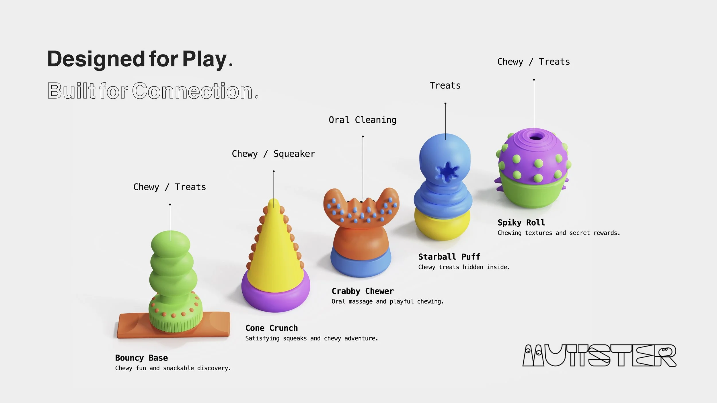 The idea for MUTTster was sparked by conversations with pet owners who described guilt and uncertainty about leaving their dogs alone. “I was interested in how a physical object could offer emotional feedback,” Nymph explains. She went on to design six interchangeable module shapes, including treat-dispensing units, oral care textures, and chew-friendly surfaces. All parts were engineered with a unified interface so that any 'A' and 'B' component could connect modularly.