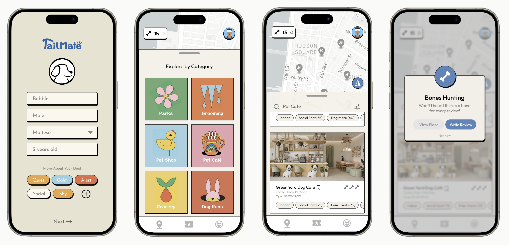 In developing Tailmate, Nymph sought to address the emotional mismatch often seen between pet needs and urban environments. “I started by researching common stress triggers in cities—like noise, crowd density, and lack of stimulation,” she says, “and spoke with pet owners about their daily routines and challenges.” These insights led to the concept of emotional tagging and a user-driven feedback loop where pet owners can record how their dogs responded to specific places. Nymph tested several map-based prototypes, gradually refining the interface and simplifying tag options to ensure they felt intuitive and non-judgmental. She also explored additional features like seasonal recommendations, notification-based mood tracking, and gamified ‘mood badges’ that reward thoughtful exploration. Each iteration moved Tailmate closer to what she describes as “a feeling-first navigation tool—for both dogs and their humans.”