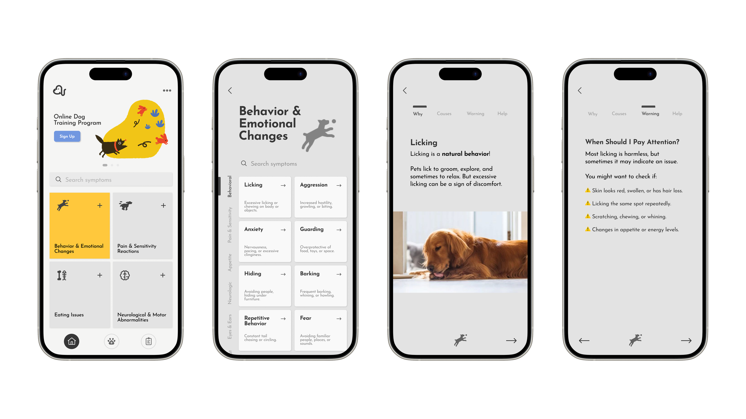 Throughout development, Nymph conducted multiple rounds of testing and iteration. “Early on, I tested low-fidelity prototypes with pet owners to see how they responded to the video prompts,” she says. Their feedback helped refine the user flow and inspired the addition of a keyword-based behavior search feature to better reflect real pet conditions. Nymph also explored the technical feasibility of pose estimation for dogs, using DeepLabCut to test how accurately specific postures or movements could be identified. While the final version of Vitapaws doesn’t include direct diagnosis, these trials informed the app’s focus: helping caregivers capture diagnostically relevant footage without losing sight of the emotional realities of caring for a sick pet.