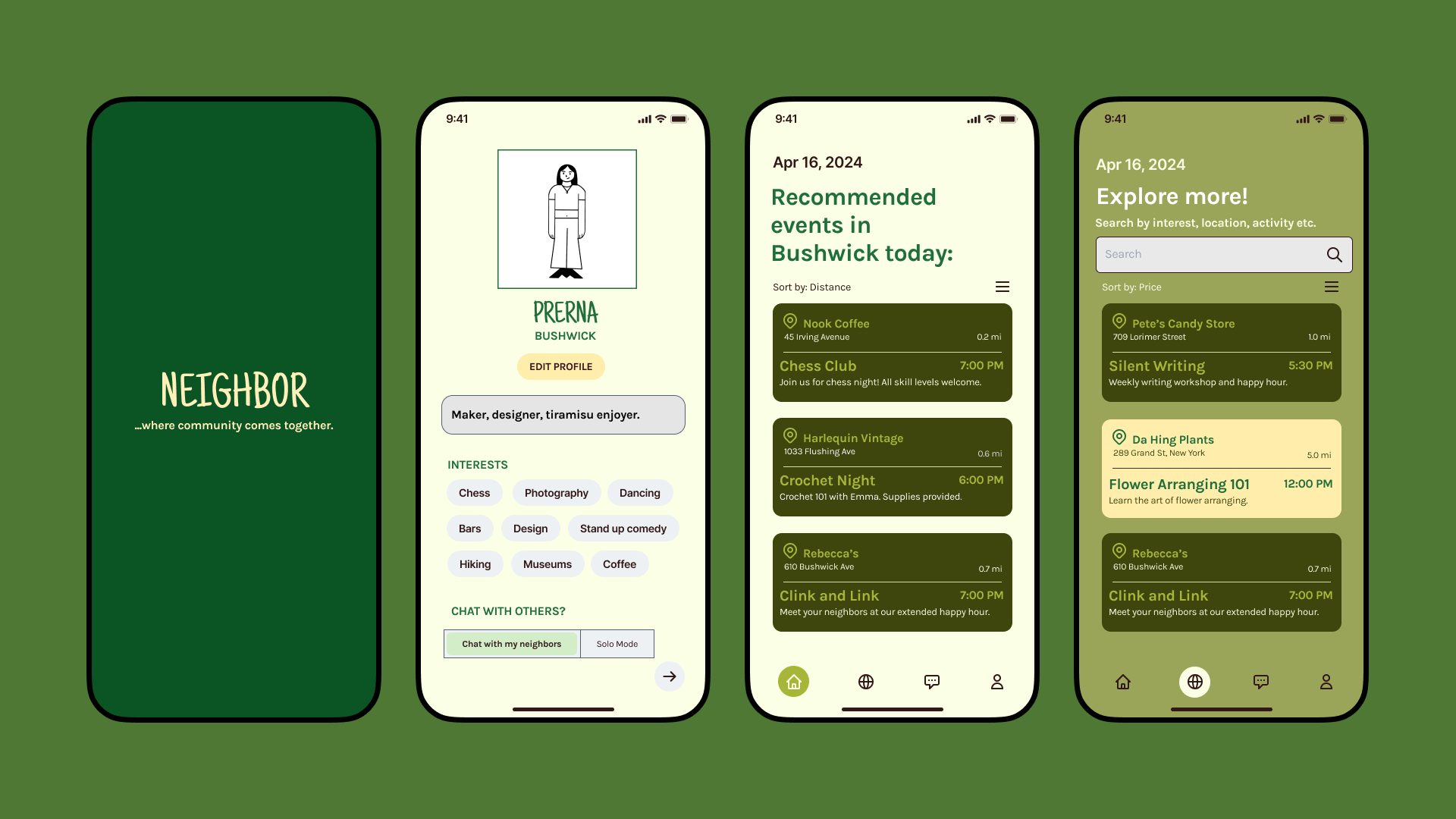 Reflecting on the Public Characters in her own life, such as the pigeon man in the park and the guys at the bagel store, Prerna envisioned Neighbor, a community-centric app designed to foster connections among neighbors by recommending local events and meetups based on common interests.