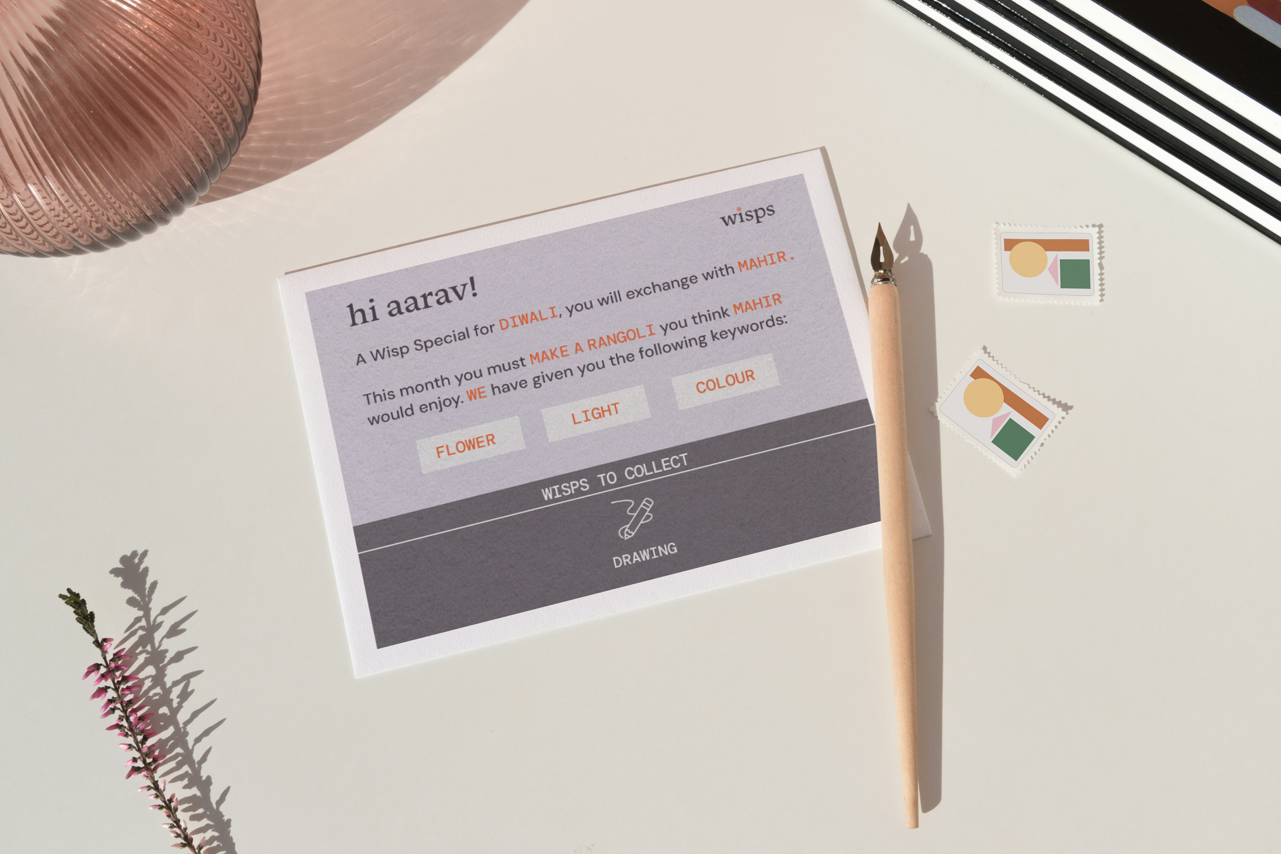 Each Wisp prompts a simple act of embodied memory. For example, prompts might say “Walk through a place they would love” or “Pick up a stone from a trail you wish you could hike together”or “Find a matchbox of a restaurant you know they would love.”