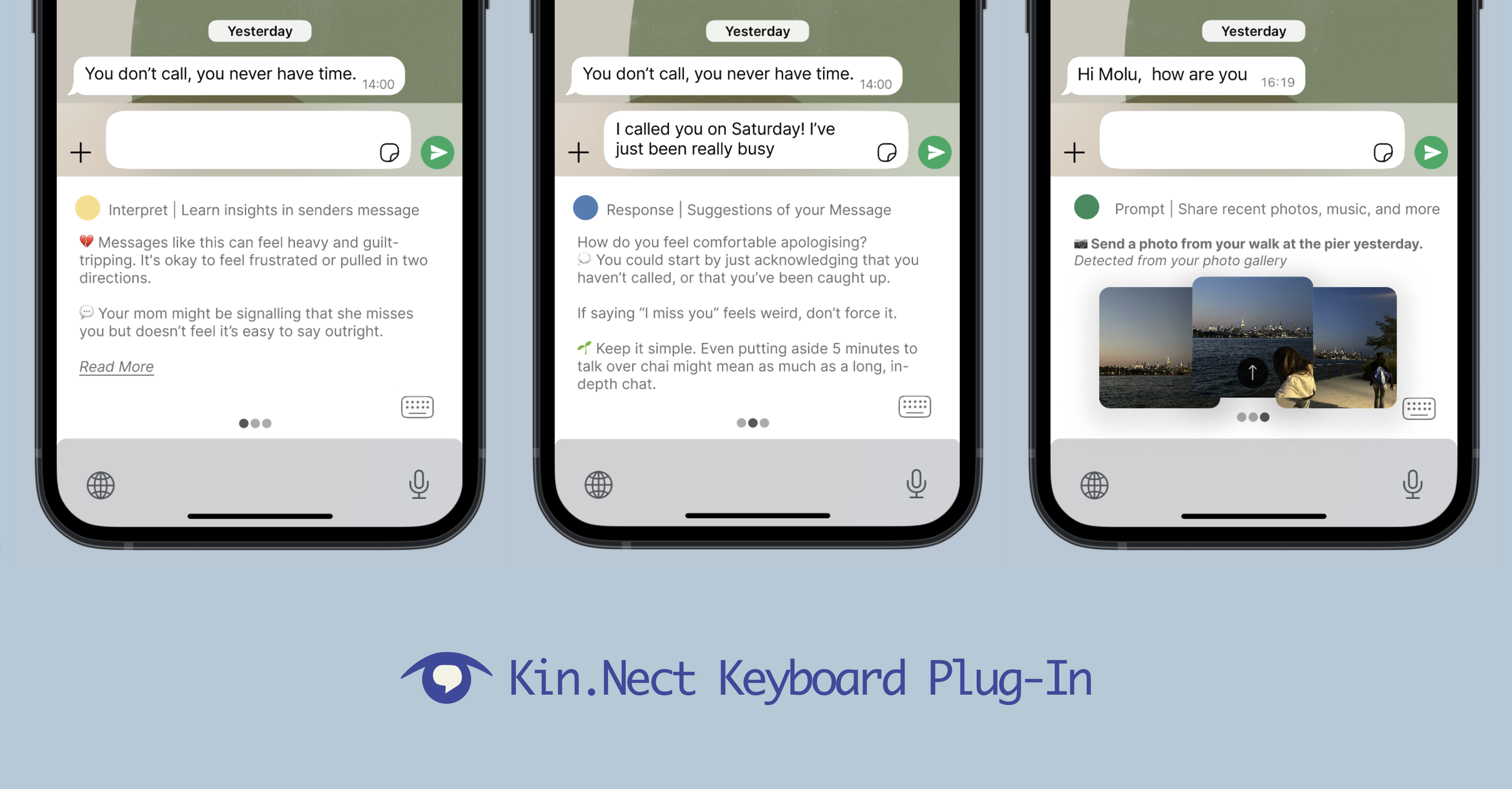 Built on this archive, Kinnect also offers a lightweight keyboard extension that supports everyday conversation. As users text or message loved ones, Kinnect draws from the emotional database to suggest small prompts—like sending a photo when words feel difficult, or offering a check-in nudge when tone feels uncertain. Rather than acting as a chatbot or therapist, Kinnect stays quietly in the background, encouraging connection without pressure.